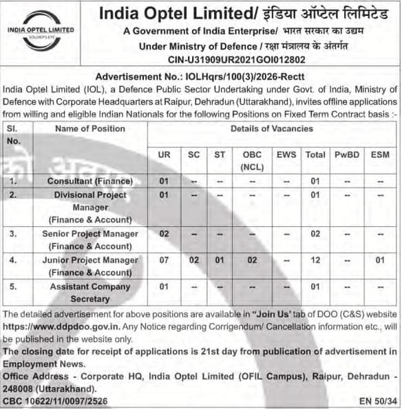India Optel Limited (IOL), a Defence Public Sector Undertaking under the Ministry of Defence, Government of India, has released a recruitment notification inviting applications from eligible Indian nationals for several finance and management positions on a fixed-term contract basis. The posts are based at the Corporate Headquarters, Raipur, Dehradun (Uttarakhand).