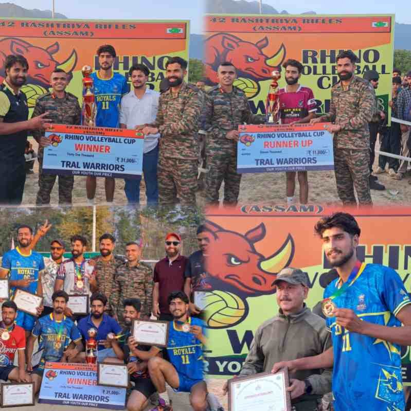 Pulwama, Sep 21: The much-awaited final of the Volleyball Tournament organized by 42 Rashtriya Rifles (RR) was held today at Bajwani Sports Stadium, Tral, where Royals Volleyball Club Srinagar clinched the title by defeating Outlaws Volleyball Club in a thrilling contest.